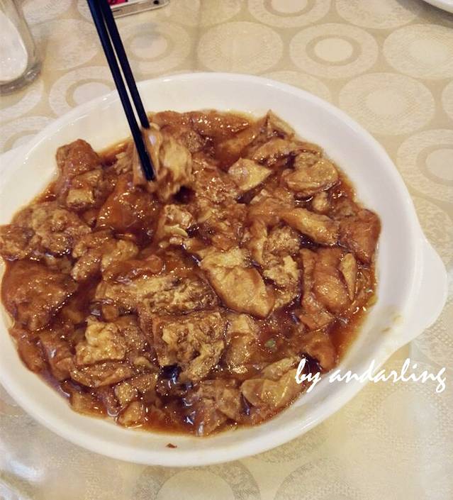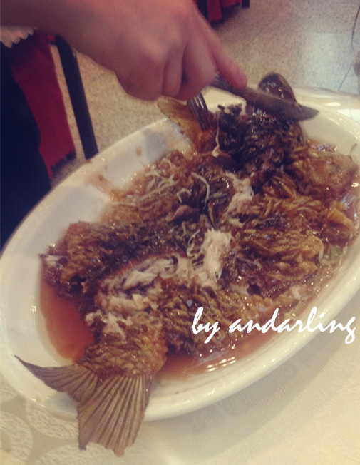 蹭蹦鲤鱼,笃面筋是招牌菜,我们俩饭量小,两个菜就撑得要命,那个鲤鱼真的很不错,上来的时候是整条鱼,服务生会帮忙切开,味道酸酸的,跟东北的松鼠鱼很像,笃面筋稍稍有点咸,不过总体来说很棒。