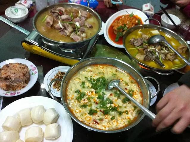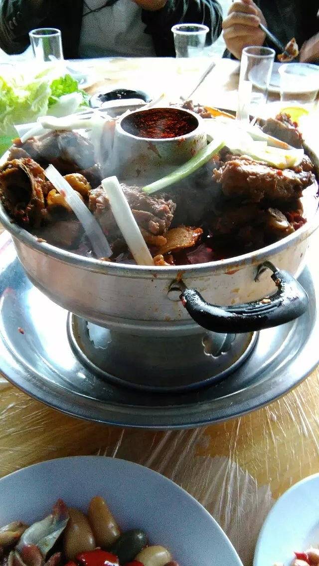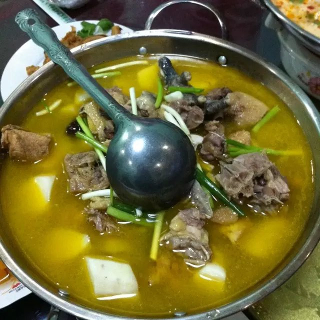 折耳根和格格。折耳根就是鱼腥草啦,喜欢的人喜欢的不得了,我是敬谢不敏的,先天性对这种味道感冒。重点说的是后面的“格格”,此格格其实是以盛具来命名的,主要是以羊肉和牛肉为主。餐桌上的那盘是比较大,一般来说,就是以下面这种为主。