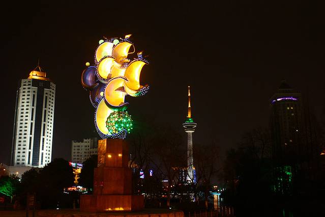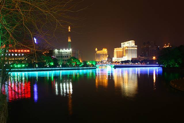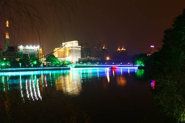 夜色中的濠河,美的是银镜如水的感觉。彩色的灯流在濠河中蜿蜒流淌,河边绿树掩荫,恰如一条翡翠项链依恋在通城少女的颈项上。