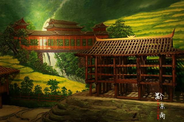这是吊脚楼的模型。苗族大多居住在高寒山区,山高坡陡,平整、开挖地基极不容易,加上天气阴雨多变,潮湿多雾,砖屋底层地气很重,不宜起居。因而,苗族历来依山傍水,构筑一种通风性能好的干爽的木楼,叫“吊脚楼”。