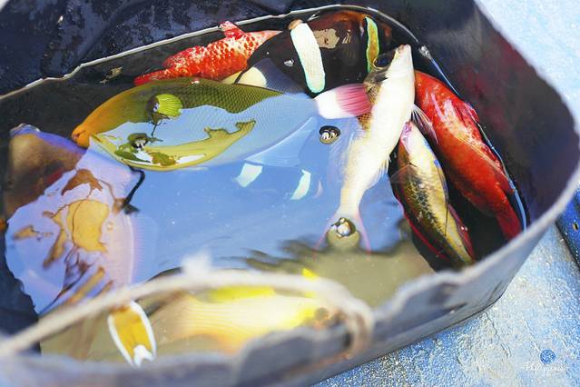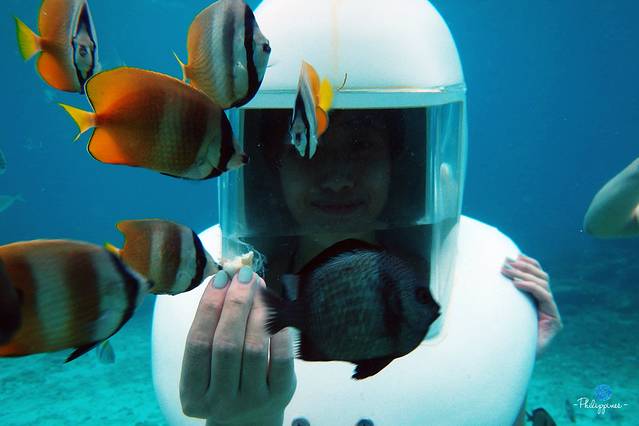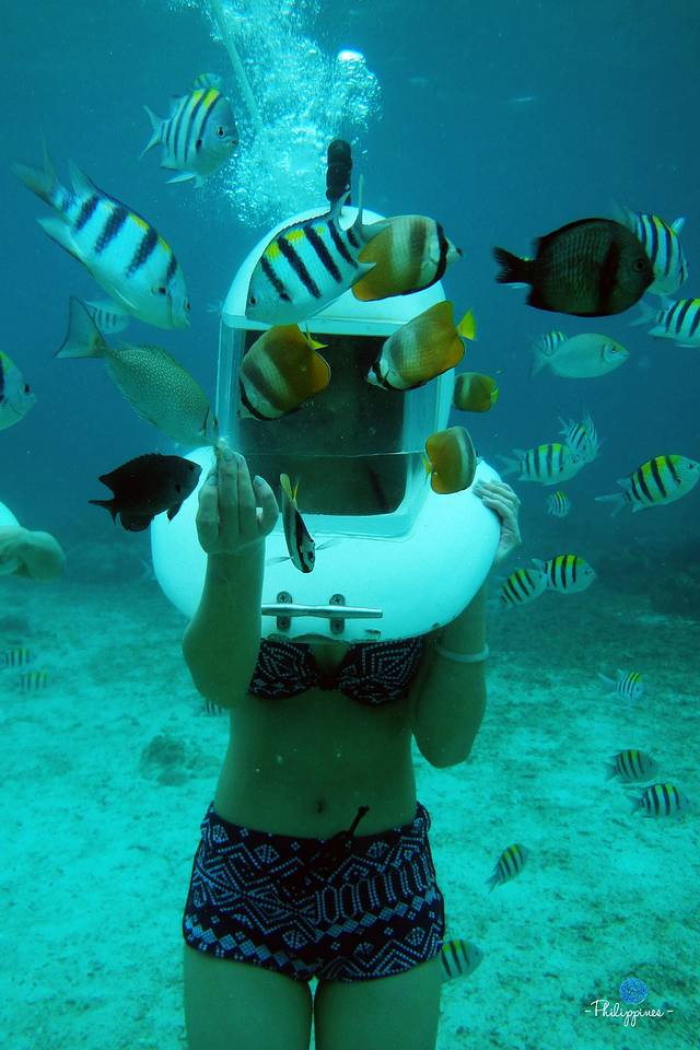 被放完风筝之后我们又被送回海上平台,然后转船到了helmet diving的地方(类似一个小小的潜水平台吧)。有当地人给我们讲解一下头盔的使用方法和海底的常用手势,之后逐一下水。下水的人直接穿泳衣就好,不需要穿潜水服。过程是这样的:人踩着平台上的梯子下到水里面,只有头露出水面,旁边会有穿深潜装备的潜导扶着,然后平台上的人把头盔放在肩膀上,潜导会带着人下去,放到海底,下水的人是可以站在海底的,没有珊瑚,不用穿潜水鞋。然后潜导会给面包,用来喂鱼,并且给我们拍照。海底漫步比较适合不能深潜的人,因为深度大概也就6-8米吧,不过耳压的问题还是一样会出现,要随时调整。水下鱼不少,但没有珊瑚,水也不算太清(主要是人太多)。不过玩一玩还是不错哒。