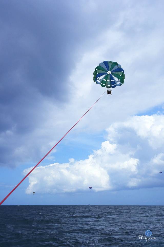 Parasailing就是最近微博上很火的邓超孙俪玩的那个啦。我们从S1出发,坐船到一个海上活动平台,转另外一艘船出去,到了风大又开阔的地方,小黑就把我们绑到伞上面,然后像放风筝一样把我们放上天……大概10-15分钟时间吧,没有什么危险,感觉还不错。