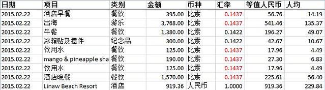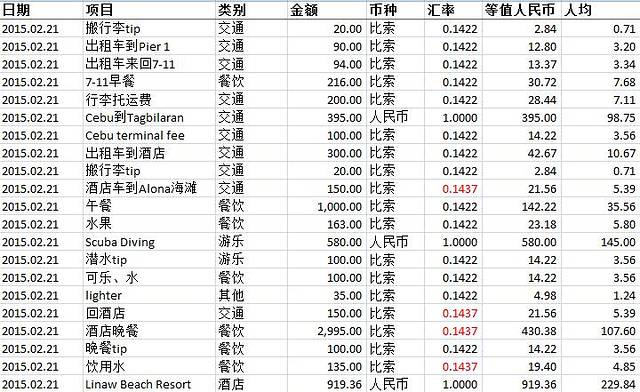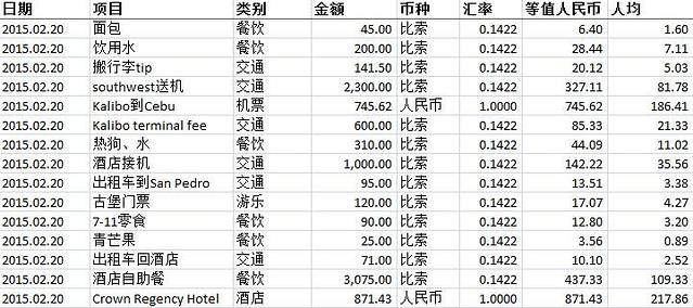 小费:长滩岛的当地人要小费的时候都很凶,不给就恨不得拿刀来砍了,宿雾、薄荷、马尼拉就都没有这种情况。一般,潜水啊或者别的活动项目我给了40-50P/人,搬行李啊什么的给了10-20P/件,就餐一般就把找零留下(当然,也看服务质量)。我在飞机上遇到的马尼拉阿姨说一般给消费额的10%,至少也要50P。说实话,小费问题我也头疼,也不知道给的数字是多了还是少了,供大家参考吧~