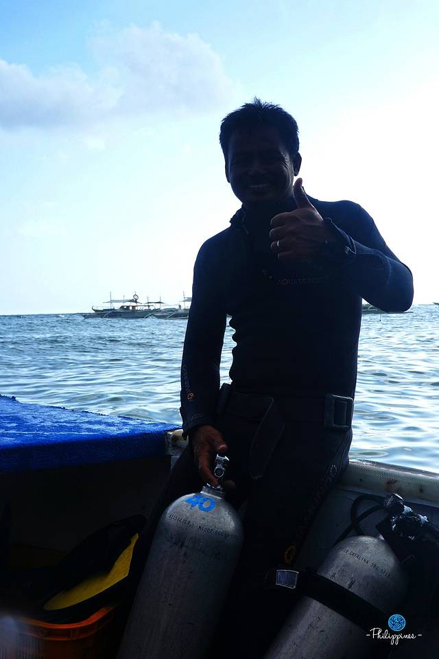 吃过饭后,到潜店去签协议听讲解。Scuba diving,也就是体验潜水,是由专业的有资质的潜导带着下水的。在水下不需要游,也不需要控制背心气压和深度,只要自己调节耳压并保证咬好呼吸嘴均匀呼吸而已,其余都由潜导来负责,学员乱动只会给他们造成困扰。薄荷岛的体验潜水是一个潜导带一个学员,潜导非常负责,给我很大的安全感。从Alona沙滩出发坐船大概15分钟就到潜点,潜导先下水,然后我们再下水,潜导会带着我们下降。