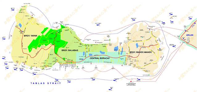 这就是长滩岛唯一的主路,地图中的红线,从骨头的一端到另一端,从码头贯通整个岛,路两边有小路就可以走到沙滩。主要交通工具就是摩托三轮车,游客包车在主路上短途(S1~S3)一般60P左右,去更远的地方可能会100P或150P不等。如果是和本地人一样搭车只需10P或20P的样子,不过游客只要上了空车的,司机都不愿意再搭客了,都会算你包车了。