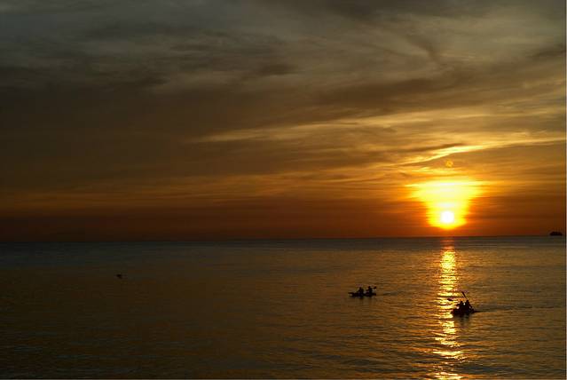 在白沙滩,在落日下游玩的人们很多,云层较厚时色彩就是这样。