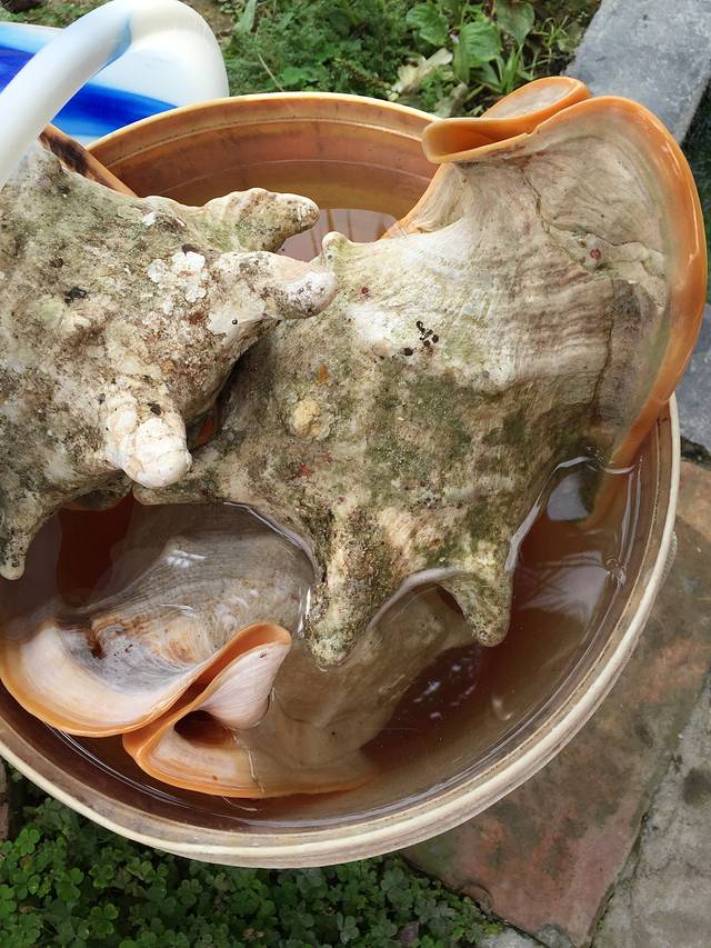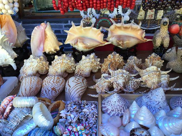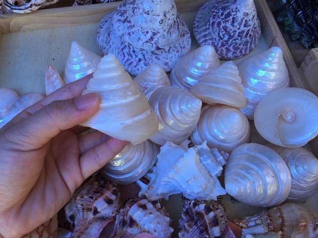 走到最后一家,竟坐了下来聊,呵呵。卖家是一个热情耐心的大姐,脾气特别好,跟我们说了很多,回答了好些我们问的问题。原来那些看起来那么完美的像耳朵的螺是真的,不是我们想象的人工制造。附一张还没加工的螺,正泡在水中等待打磨加工。她家的商品~~~好多螺