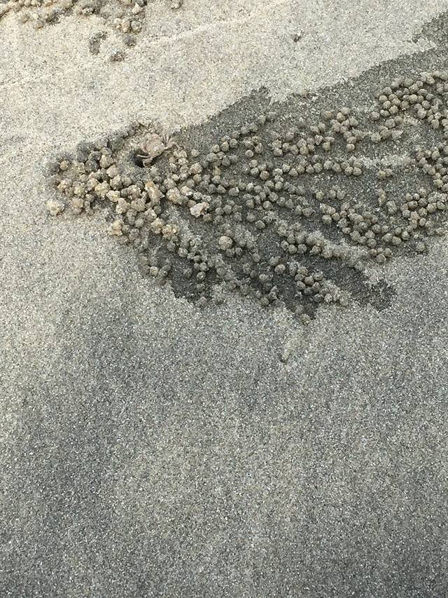 看到很多小螃蟹在挖洞,搬出一颗颗小圆沙。坏坏地故意填掉一些小洞,看他们会从哪个洞出来