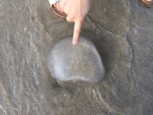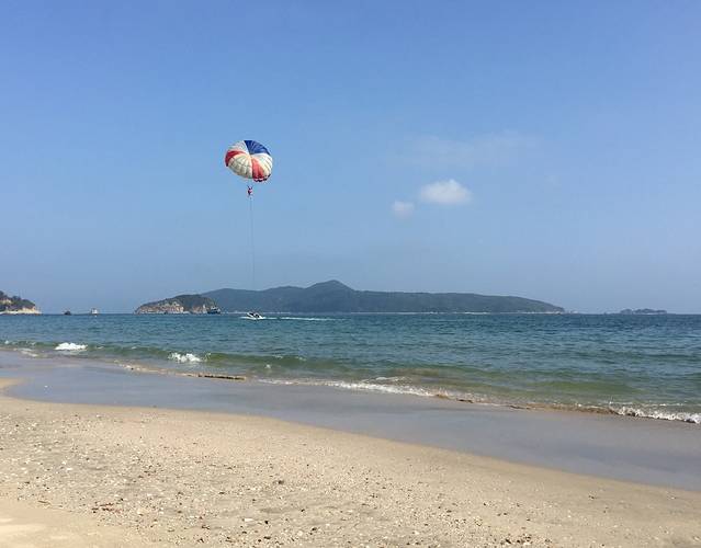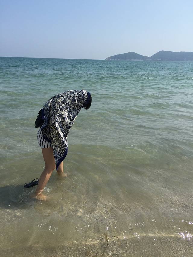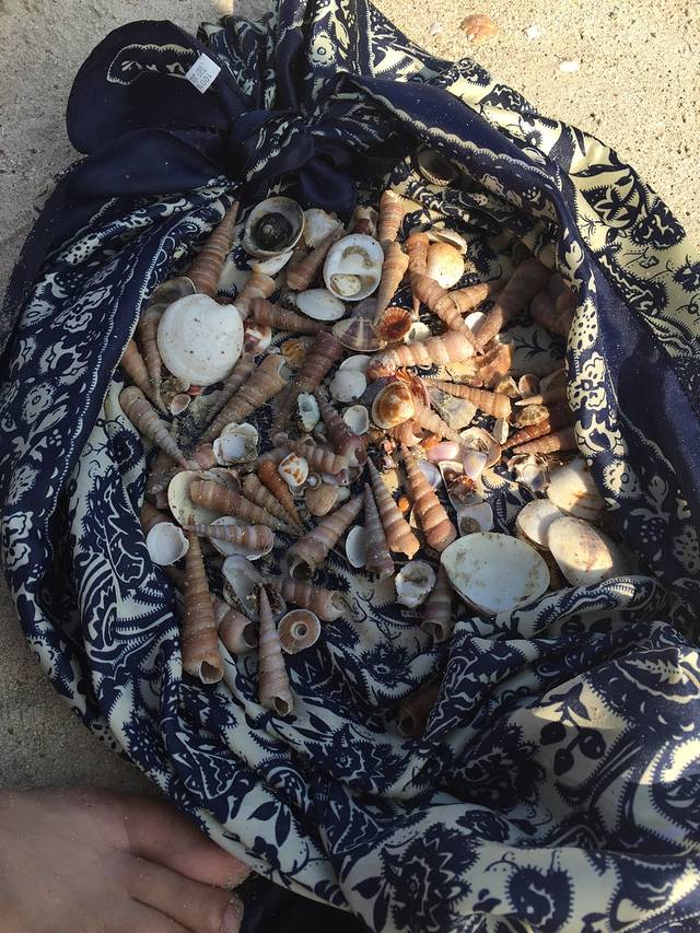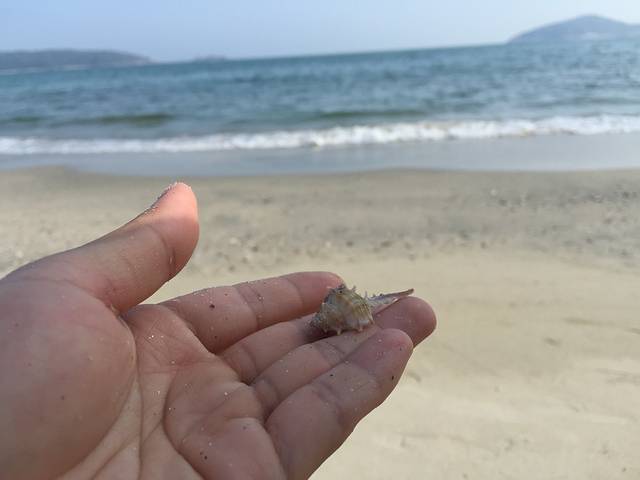 忘了带塑料袋去装贝壳,好在带了一条遮阳用的方巾!为了装贝壳,姐是豁出去了,没撑伞阳光底下捡了两三个钟……光顾着捡贝壳背后来了大的浪还被喂了几口海水,好咸!!