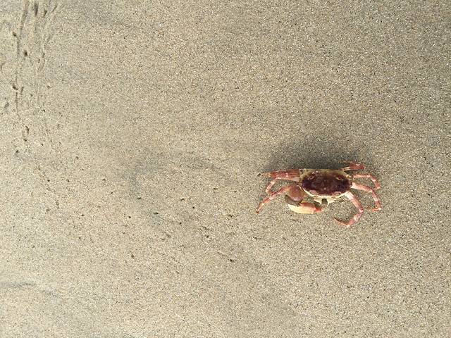 离开菜园,我们再到海边感受新鲜空气的味道。太阳还没露出来,天色有点阴阴的。看到有渔民在海滩卖海鲜,那人说一大盆蟹才50元。没有心动,昨天吃的蟹已经够多。在那附近看到好几只将近死去的蟹,不知道是不是渔民扔的,其中一只还可以爬~~只是少了一只大钳……蟹果然是横行……不过不霸道 呵呵