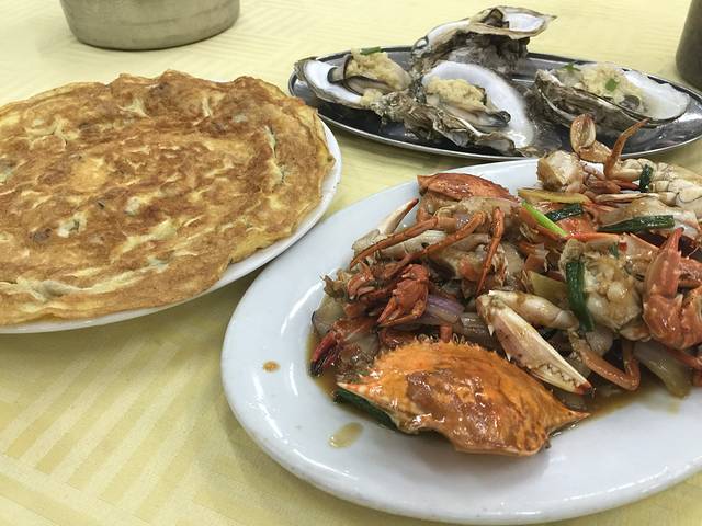 走了三四家,简单看了一下菜牌,最后还是选了第一家(海都餐厅)!因为另几家都是按菜牌上写的报价,只有第一家的年轻阿姨说菜牌上面的是旺季的价格,实际上可以便宜一些的。两个人吃不了很多东西,最后点了三样,蚝仔煎蛋、生蚝、蟹……茶位费每位2元,共93元!