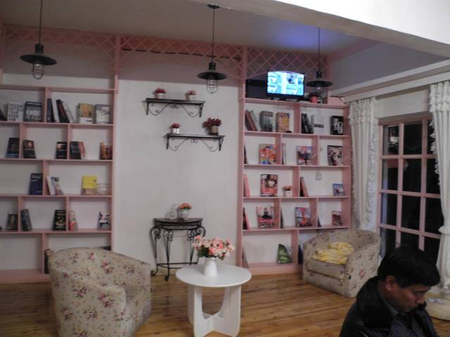 旅舍的走廊,外面桌子是实木的天气冷就很冰,老板很贴心在桌子下放了一个大烤炉桌上放了一床很厚的被子,好暖和~~~~~