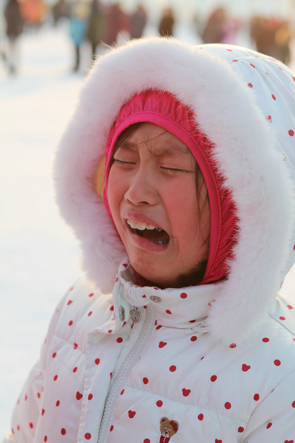 因为,没有带屁股垫子,不方便玩雪滑梯而哭泣。