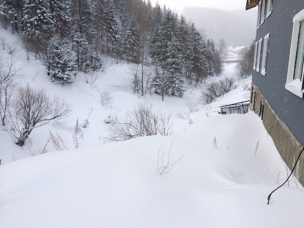 从河谷一直堆到房子边的雪。