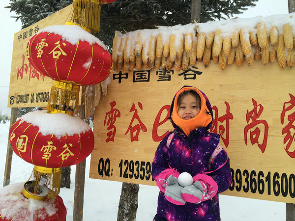 赶紧把丫头揪过来拍照。她还一脸不情愿,惦记着玩雪球。