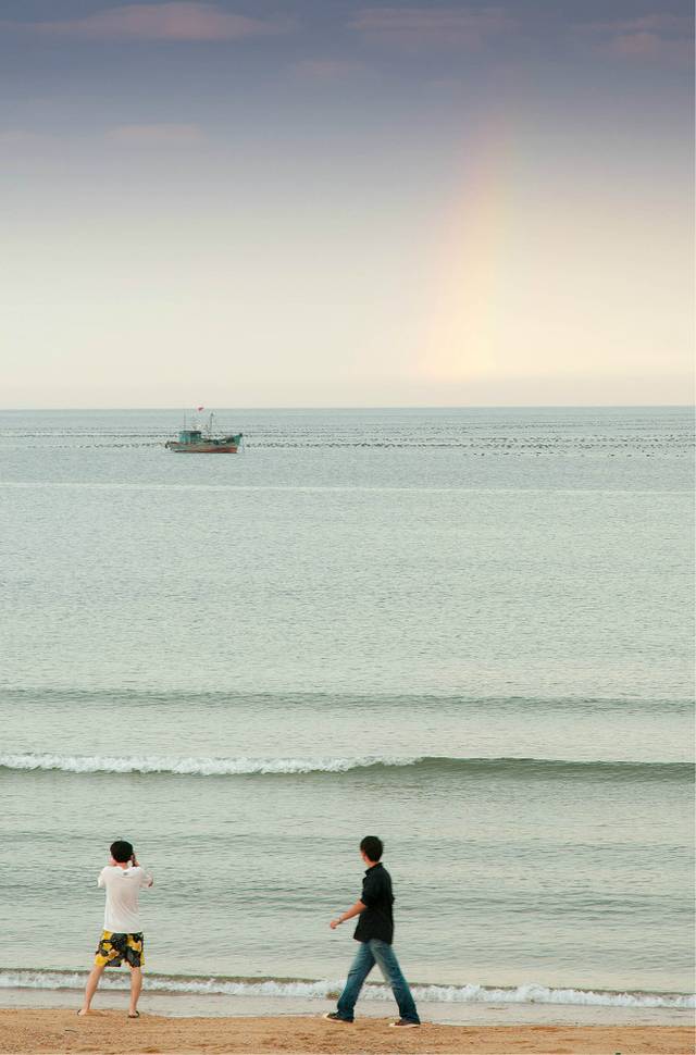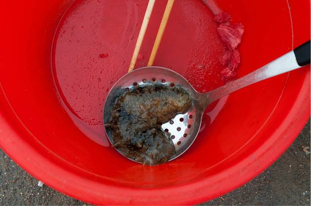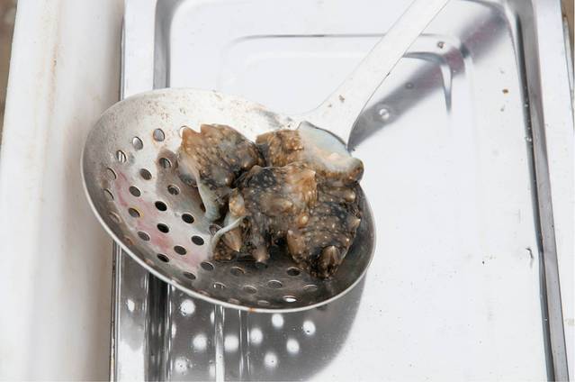 在蓬莱海边,渔民把新打上来的海鲜就地出售,并代客加工。我买了一只最大的海参,50块。渔家大姐熟练地用剪刀抛开海参的肚子,剪头(她说海参有牙,不能吃)去尾,然后,剪成四块,我说肚子不好,不敢生吃,她就用旁边的煤气炉上烧了一点热水(不烧开,热了就行),用笊篱盛着海参过了一下热水,用牙签扎着吃。口感很有韧劲,跟饭店里用火碱发过的截然不同,口味咸了吧唧的,蘸着醋吃,会好点。据说是大补,可是对我没感觉,我好像对各种所谓补品,包括西洋参之类的都免疫,呵呵。