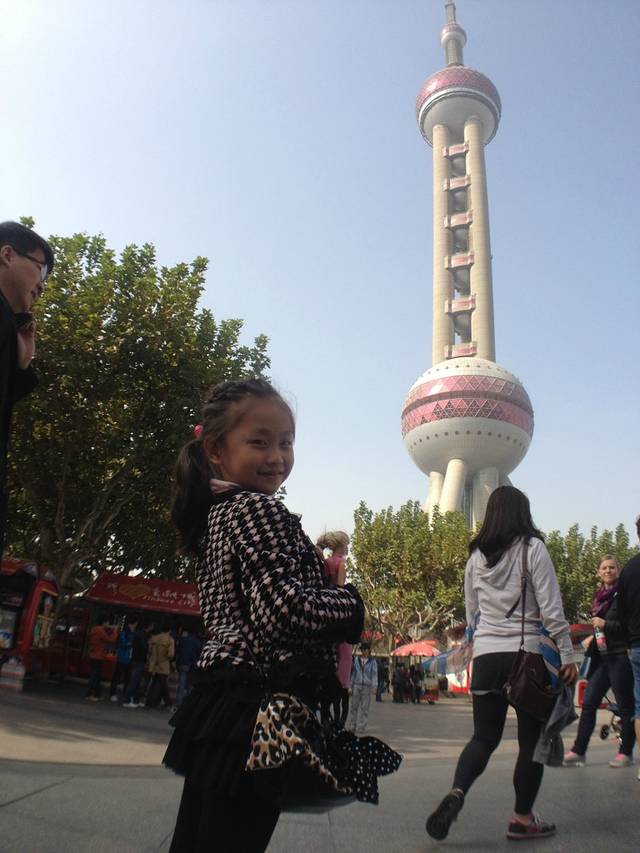 一出地铁看见东方明珠,就开始兴奋,要求拍照,然后就 各种多角度拍,甚至背课文 。