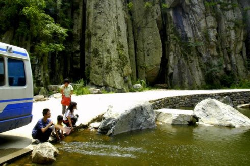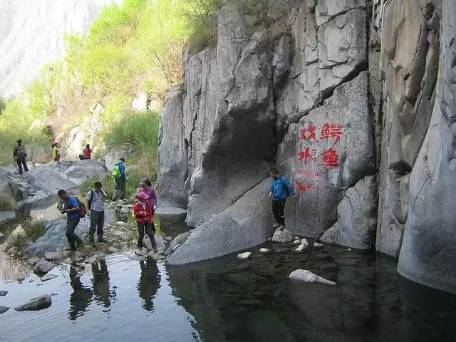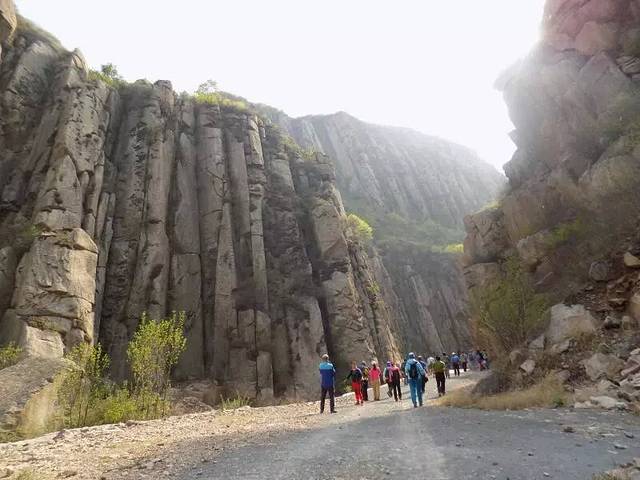 我们一路感受着山间晨风的吹抚,呼吸着无比清爽空气,徒步来到板厂峪山脚下美丽的崖沟。谭瀑流水,田畦青翠,峭壁如屏,砂岩如朱,好一派风光秀丽的自然景观。