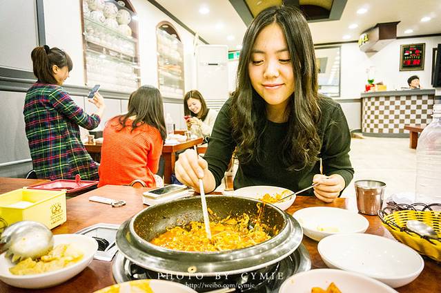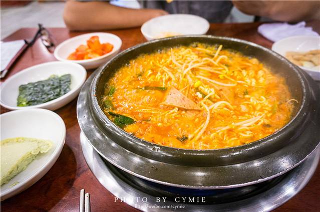 晚餐在西面吃货一条街吃了部队火锅,是在网上搜的,韩文名字是“의정부부대찌개”,可以提前复制到手机里,然后直接复制到谷歌地图app导航。我就是这么干的,因为实在不知道韩文应该怎么输入。
