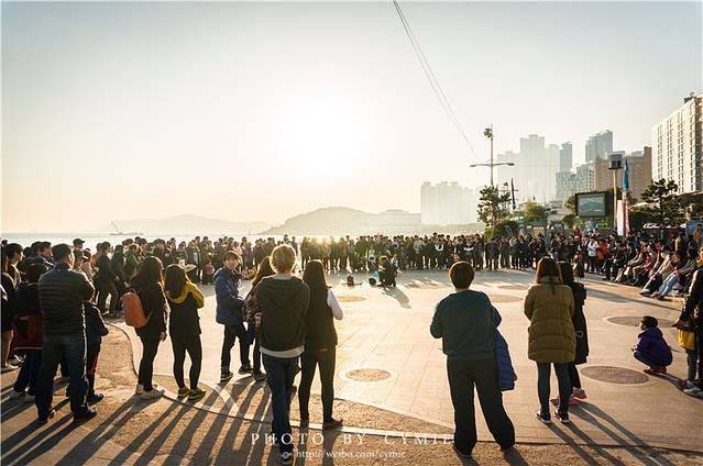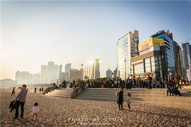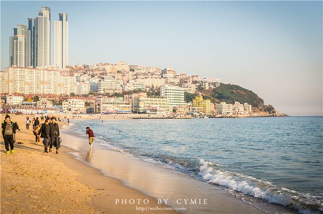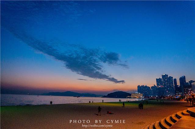 海云台的海滨,不是东南亚的那种碧蓝的海滨,沙子是黄色的,但又没有那么金黄。