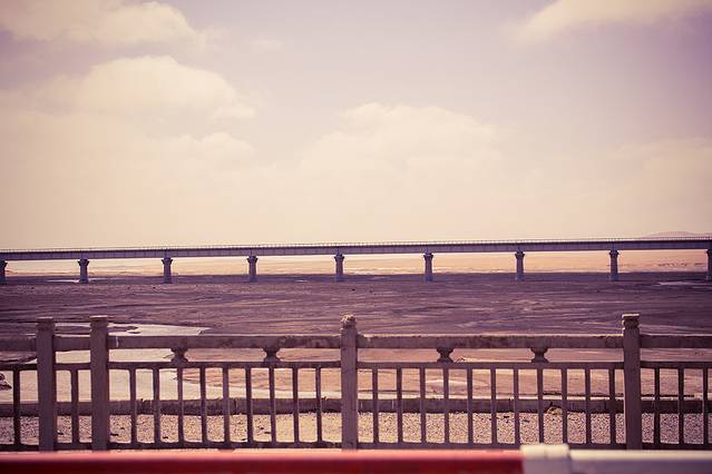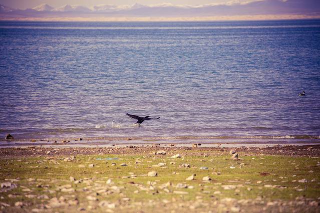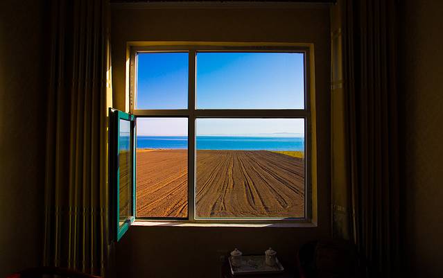 由于之前已经看过几个高原湖泊,所以对青海湖不是很期待。不过到达湖边之后,入住蓝天宾馆(恩,跟新都桥的同名),在宾馆外面发现了一个拍照的好地方,有平坦的红土,草地,远处是蓝色的湖水,广角整了两张。