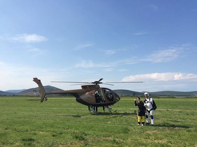 刺激的环节终于要开始了!由于是直升飞机,所以一次只载四个人。在轰隆隆的螺旋桨声音中我们缓缓起飞了。直升机的好处就是不用滑行直接升空,并且没有舱门,有一只脚是在舱门外的。耳边呼啸而来的风声让我感觉有点压力,但是那种脚下便是广阔的草地和流淌的河流的感觉真是太奇妙了!还好穿了连体跳伞服,实在没想到明媚阳光的天空中居然如此寒冷。教练把他跟我的保险带绑在一起,那一刻我蹦蹦跳的心脏似乎平静了不少,毕竟有教练在还是有保障的。Dimitris还向我介绍四周的风景,在这么高的地方可以看到很远处。
