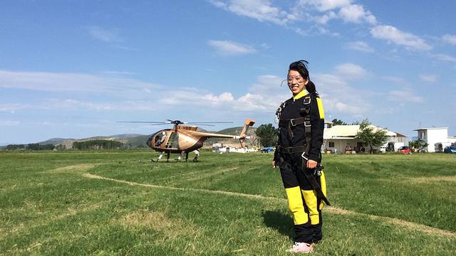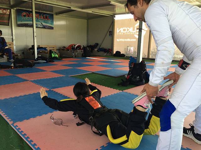 接着进入最重要的一个环节——教练讲解。虽然只有短短十多分钟,但是对于顺利而愉快的跳伞体验来说非常重要。教练一边讲解一边示意,我也跟着照葫芦画瓢。在听到教练的口令要跳出直升机的时候,身体要呈“香蕉型”,双手、双腿和上半身都尽可能往后伸展(在跳伞后我才明白这个动作是为了尽可能减小你在自由落体时的阻力)。如果教练拍拍你的肩膀,你就可以把双手往两边伸,感受一下风的吹拂。再拍一次,你就要把手收回来抓住胸口两侧的安全带。降落的时候双腿微曲往上抬45度,脚尖也往上,做滑行状。如果你有点担心还可以在垫子上先演习一下动作,然后穿上酷酷的跳伞服就可以出发了。