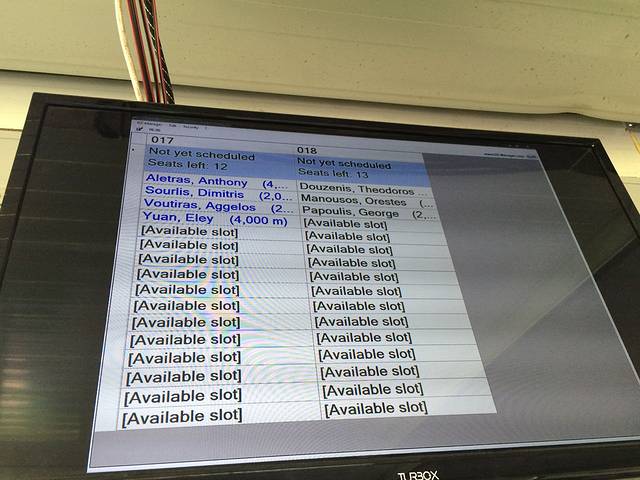 帅帅的老板远远就迎过来,果然是典型的希腊运动健将的身材。他跟我介绍了一下项目和价格情况,另外还要填写个人资料以及“生死状”,当然签这种免责声明是国际跳伞惯例。因为我是第一次跳伞,所以选择了Tandem。Tandem就是你会跟教练用保险带绑在一起,降落伞背在教练的背上,开伞的动作也是由教练执行,基本上你只需要在自由落体和降落的时候配合教练,其余时间就放松心态享受过程就可以了。填好资料后,老板带我认识了我的跳伞教练Dimitris,这时候休息室的电视上也显示了我的名字。老板告诉我,Dimitris有6000多次的跳伞记录,是这里面相当资深的一位教练。