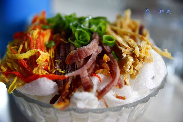 天还没亮,我们已经出门准备扫片去了。在一家刚刚开门的小铺子里,寻到这种叫“头脑”的吃食。老板说年初二打牙祭就吃这个,寓意一年做事顺顺利利。其实就是用肉干蛋饼丝荷包蛋加炸年糕,用醪糟开水冲泡,咸甜俱备,风味独特。