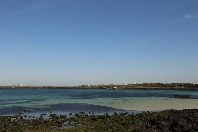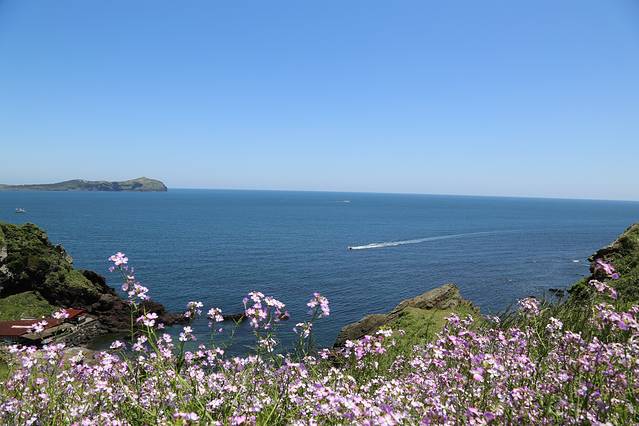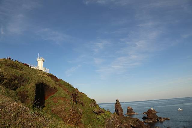 从日出峰下来,在乐天随便吃了点,炸鸡翅绝对推荐!比昨天吃的校村炸鸡好吃多啦。顺便在Dunkin' Donuts买了甜甜圈,喝的东西也蛮不错~中饭过后步行去城山港,大概也是1公里多的路程,脚力不强的也可以选择打车。城山港每整点有船发往牛岛,五月最晚的一班返回的船是18:30,我们坐的14:00的船,往返船票5500,需要填两份单子,往返乘船时和票一起交上去。上了船之后就颇具韩国特色啦,大家都把鞋子脱掉,坐在船上,15分钟左右就到牛岛啦。上岸之后,我们去租自行车,5000元三小时。租机车需要韩国国内的驾驶证,所以我们只得选择自行车啦。自行车的弊端是岛上有很多上坡路,骑着挺累的,灯塔公园也没有骑上去,但下坡感觉棒棒的~也可以选择坐岛上的巴士,只是需要等车,相对不自由。我们就逆时针环岛一周,去了白沙滩、还有一个海水浴场,有人停留的地方,我们都停下来看看,自行车没有锁,就扔在一边。海水蔚蓝,沙子细腻。慢慢悠悠的环一圈,乘17点的船回去。(这里要提醒租自行车的朋友们,手上记得涂防晒霜,还有脸部尤其是鼻子,晚上回去我的手就红肿啦,还以为是过敏,紧张兮兮的吃了药,后来一照镜子看到发红的脸才知道是晒的。)