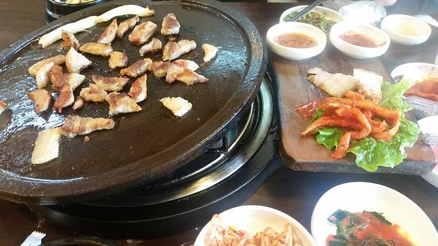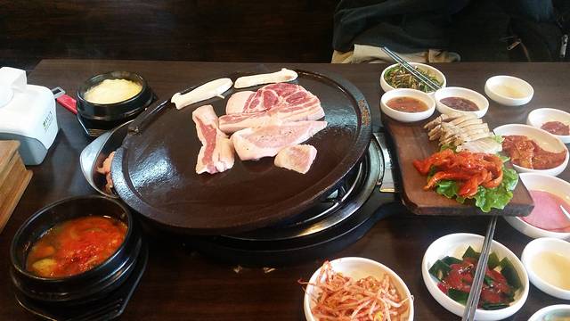 从山君不离回来,坐到市厅提前下车了,打车去的黑猪肉一条街。这里也提醒大家,返回的时候一般不必回到市外巴士总站,可以查看下地图,在适当的站下车,去某些地方更近更方便。去的豚,点了双人套餐,38000吧,对于两个不吃五花肉的人来说,是一项艰难的考验,不过又想来试一试。两人的套餐量并不大,烤出来了好多油,味道是比一般的猪肉好吃,但还是接受五花肉无能,把瘦肉吃了,后来又去对面的麦当劳补了点鸡翅。
