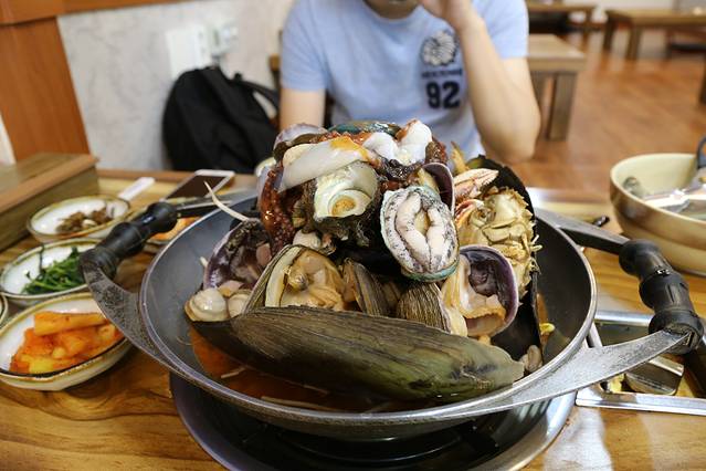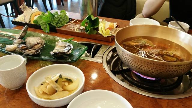 从天帝渊瀑布的东门出来,往西边走一点,就是传说中的善良的鲍鱼。我们点了44000的双人海鲜牛肉火锅,但是!海鲜不是活的!不过味道也鲜美啦~味道略微,不,是特别清单了一些,应该就是鲍鱼之类的煮的汤,没什么味道,吃的就是一个鲜美啦。(相比之下,后来吃的三姓穴海鲜锅性价比超高)