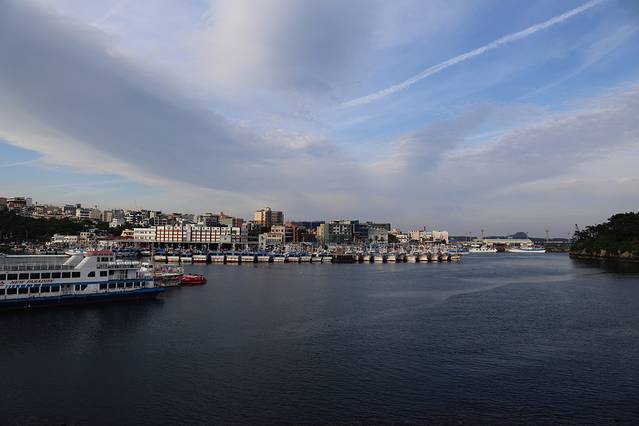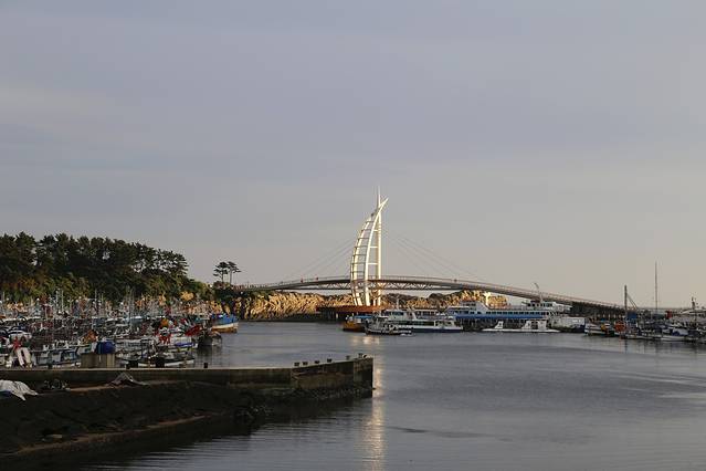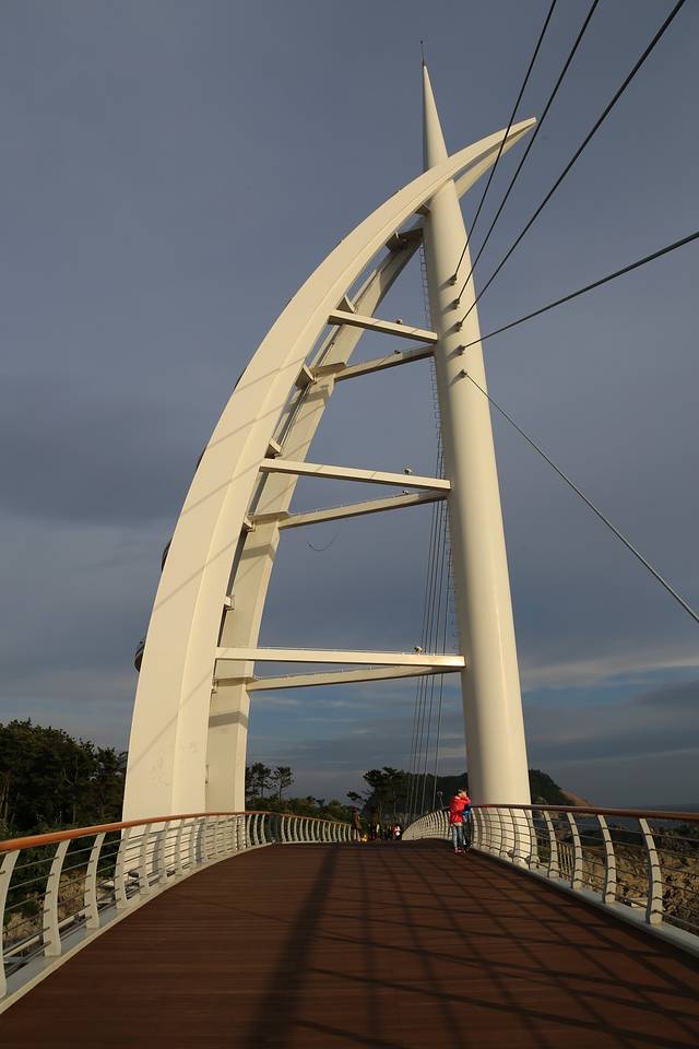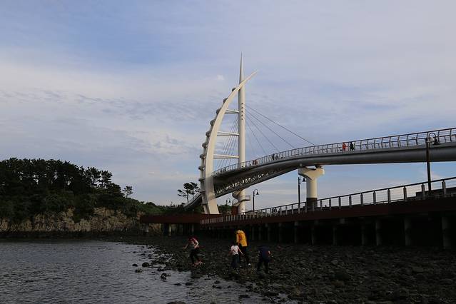 天地渊瀑布旁边就是鸟岛新缘桥,只是一座简简单单的桥啦,赶上夕阳,除了暴走外,这一天都蛮好。本来想去独立岩,看地图也在附近,不过行程进行到这里已经六点多了,我们还要返回济州市,就作罢了。