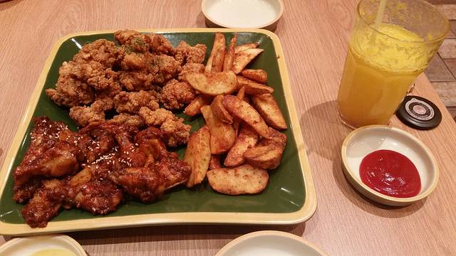 从龙头岩返回酒店大概四点,索性睡了一个晚午觉,五点多起来去新罗免税店和附近的宝健路溜达了一圈。韩国路边的专卖店买的衣服和鞋子基本都和国内的商场一样价钱,新罗免税店里就是旅行团的天下了,并不大,价格也不如乐天的官网优惠,我们没买什么东西。晚饭选在了宝健路上的一个炸鸡店,超值推荐!建议大家不要点辣的,因为真的很辣,香草原味的炸鸡块就足够好吃了。这样的一份套餐大概17000,有免费的冰水和沙拉,两个人根本吃不完。但是名字没记住。。。。总之有一个很萌的小鸡,店的对面停着送外卖的车。酒足饭饱回到酒店,再来一个香蕉牛奶,美美的睡了一觉。香蕉牛奶就不上图了,反正是每天必喝。