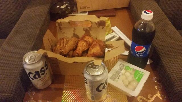 晚上八点多回到酒店,把东西放下,就去了校村炸鸡,服务员告知要等一个小时,我们直接交了钱选择了外送,顺便带了两罐CASS回去。后来外卖准时送到房间门口,建议大家直接打电话订啦。我们点了半份原味半份辣味,套餐送一瓶可乐和一份腌萝卜,两个人其实只能吃半份。