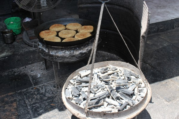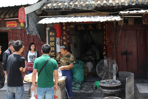 然后继续向前顺着大路往前开,开着开着就能看见喜洲古镇的一个门了哦。如果实在没看见可以边走边问,大理人民都是很善良的哇哈哈。喜洲古镇有的地方是要收费的,主要是四大家族的家属院,个人建议没必要去花那个钱看别人家房子,去看看免费的就好。然后里面有喜洲粑粑的,喜洲粑粑是特色一定要吃哦。我们去之前,朝蓝夕月客栈的管家妞妞给我们推荐了里面一家叫“和尚粑粑”的店,于是直奔主题。里面还有另外一家卖粑粑的,打着舌尖上的中国的牌子,不过觉得和尚粑粑那边的人比较多,于是就过去啦。粑粑分为甜粑粑和咸粑粑两种,甜粑粑6块一个,咸粑粑加料的15,不加料的好像10块。真的炒鸡好吃的哇~~~口水口水口水~