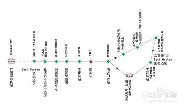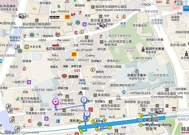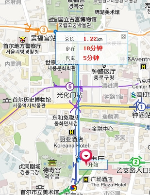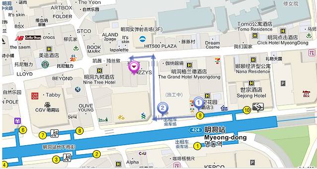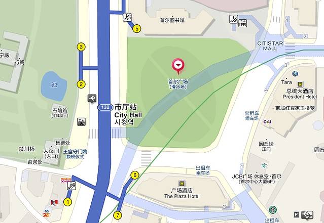 地铁线路:明洞站=Line4=>首尔站换乘(最快换乘车厢10-4)=Line1=>市厅站(Exit 5/6)