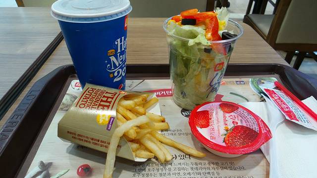 看着就满满满满足有没有~但是同样是2人份,不过似乎没有韩巢小编的图里的肉多呢~不过不影响我伙的满足感,小菜的土豆泥是甜味的,这个表示无法接受,俺是咸味土豆泥派。