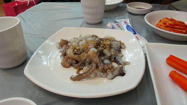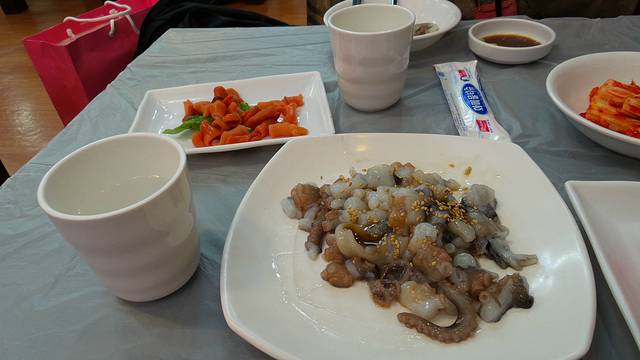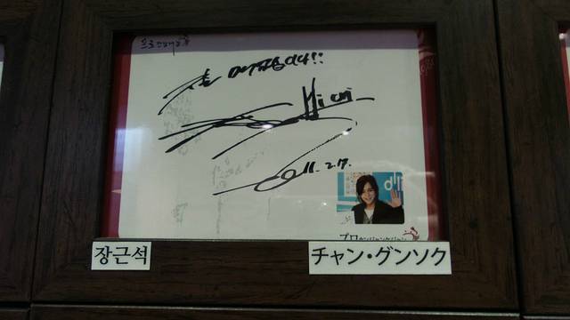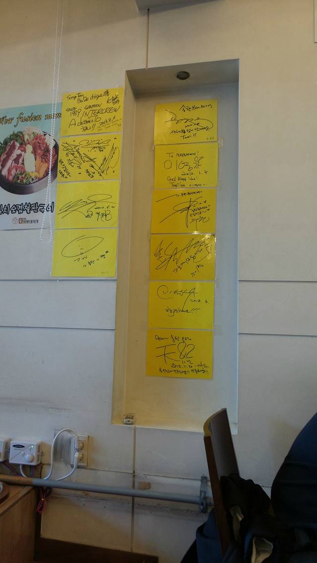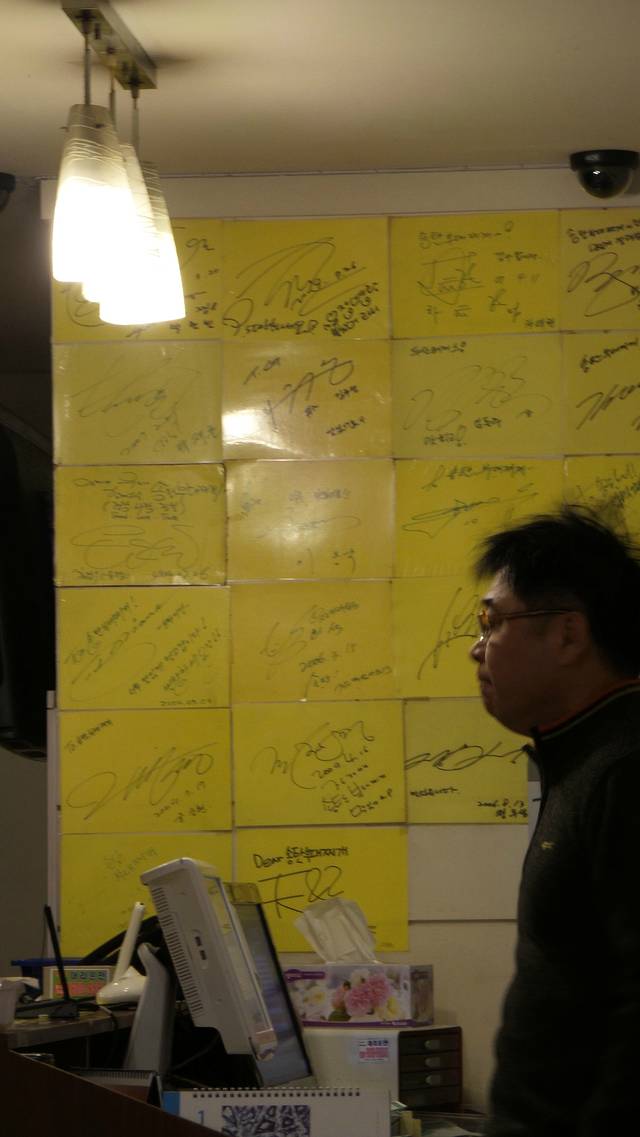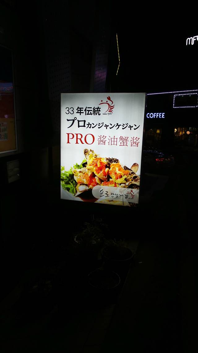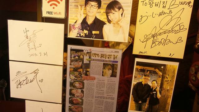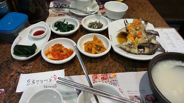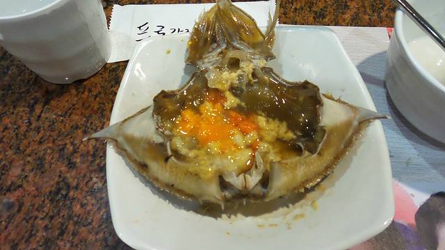 啰嗦话:玩好之后的美味宵夜,是在韩国吃过的最高的一餐,虽然价格也不菲,但是真的很赞,现在想想也好想吃。酱蟹是从二千那里得知的,这里的酱蟹食材好,蟹膏特别足,思密达推荐的吃法是蟹壳拌饭,用优惠券可以赠送一碗锅巴汤,这里面饭很足,用来拌蟹壳真是鲜美极了。小份的酱蟹一共两只,含配餐,筷子和勺子在桌子的抽屉里,自取。这家店日韩光顾客比较多,也有会中文的店员,店门口有硕大的签名墙,楼梯上也都是明星和老板/娘的合影,小帅的出现率最高。虽然是明星店,但绝不是噱头,味道真的超级赞。