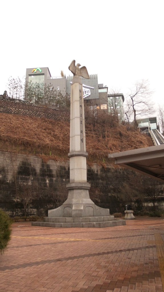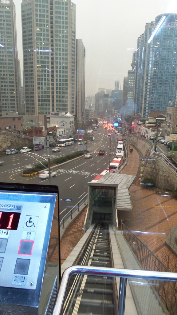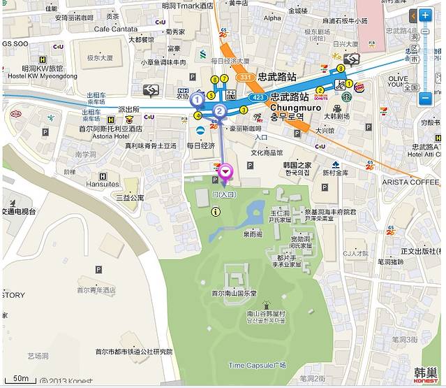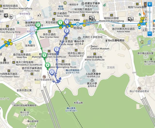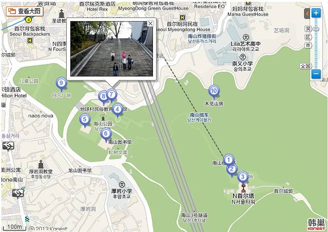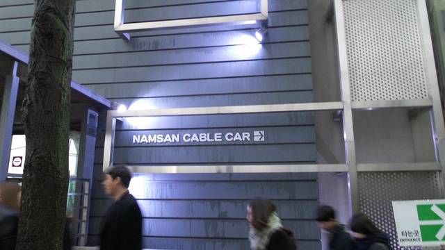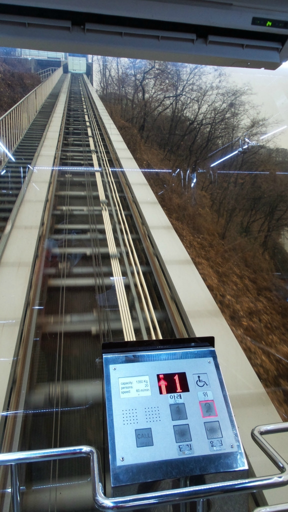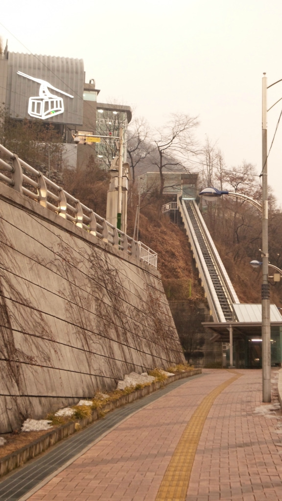 啰嗦话:因为没有找到蓝色路线,所以走到了十字路口,看到硕大的友利银行楼,于是就按着绿色路线走的,非常好找,先是搭乘透明电梯到达缆车站,1F购买缆车票,精力和鞋子好的可以考虑买单程然后沿着城郭状大道走下来,3F排队搭乘缆车,到达后其实就可以看到近在眼前的N首尔塔了