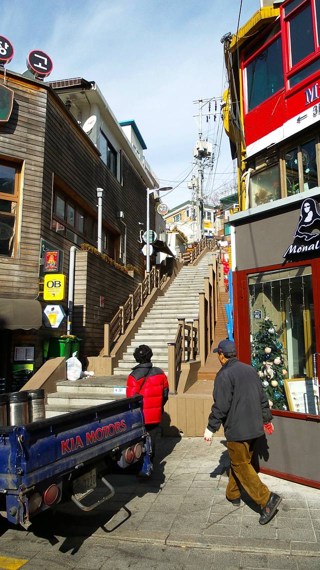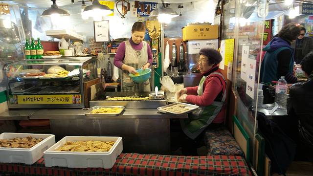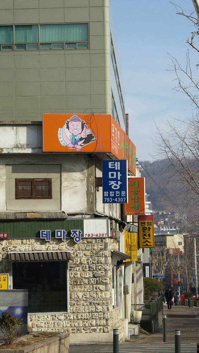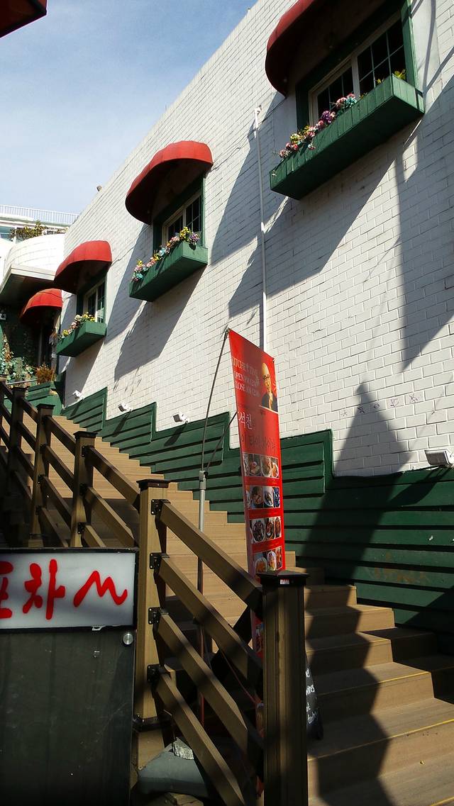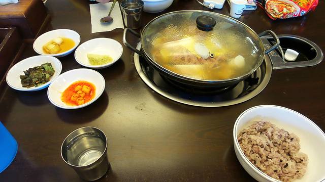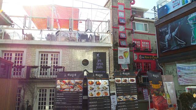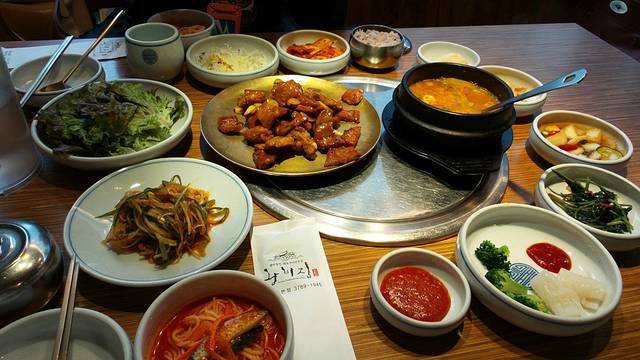 啰嗦话:梨泰院的出口处电梯坏了,以致于需要爬非常高大的楼梯啊摔。。。不过为了早饭,加油。梨泰院的资料其实也不算多,被科普得知梨泰院原名异胎院/离胎院,由于当时被美军侵占,这里属于桃色区域比较混乱,很多娃被扼杀因而为离胎院,后来因为不好听改成了梨泰院。现在依旧有很多老外,这里大街上的人英文普遍比较流利。这里晚上会是另一番风情,藏在马路两侧深处的小巷里有很多不同韵味的酒吧。至于为啥俺要来这里,主要是俺老哥喜欢大size的够HipHop的衣服,于是俺就来这片云集售给老外KingSize的服装店的区域。正好这里有家特别的饭桌,就来尝试一下。店很小很旧,但是里面都是宝贝,大妈也非常热情帮我们拍照,点了乡村御膳还得再点一个附加菜,我们点了一炖蛋,一大早丰富的早餐,暖暖的,又体验了下各式思密达小菜,还真挺好好吃的有些。