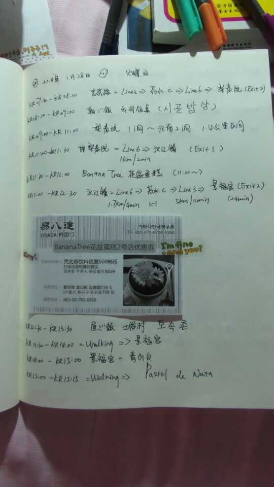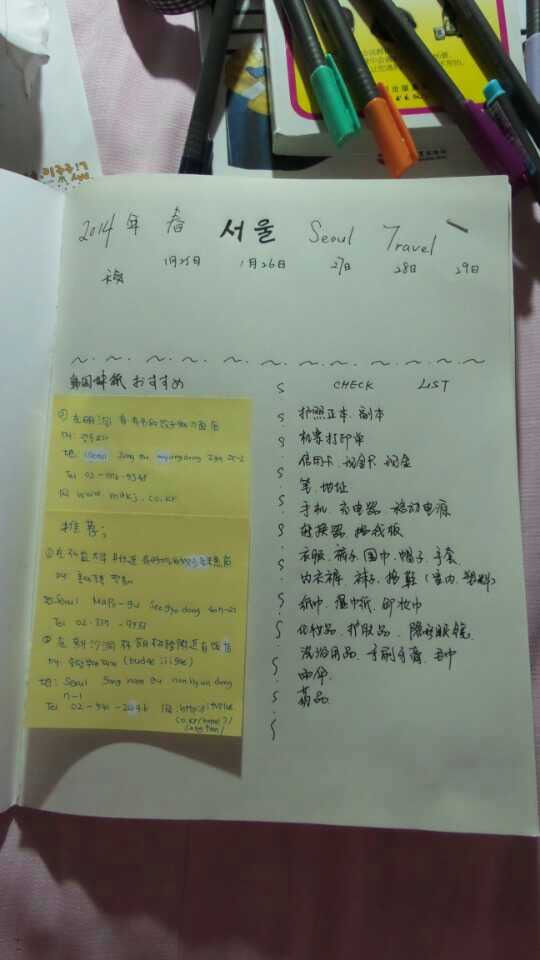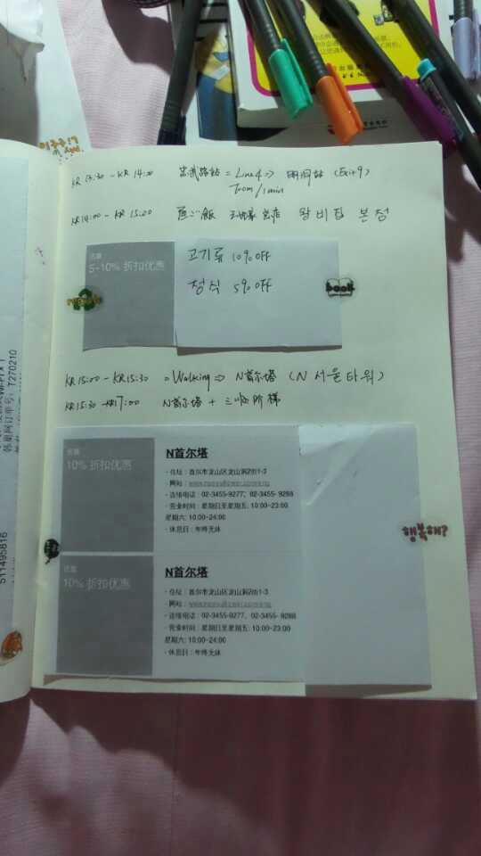 攻略自己准备了一个月,电子版和手工版,把自己小学剪报实力发挥得淋漓尽致,手工版贴满了一本的优惠券,一是用起来方便,二是防止手机没电可就没方向的情况,因为下班晚,为了准备这些到半夜,字写到后来也就变得越来越昏迷状态。便条纸是准备攻略时邻桌的韩国妹子推荐的三家店(个人觉得只有一家好吃,这可能就是口味差别)