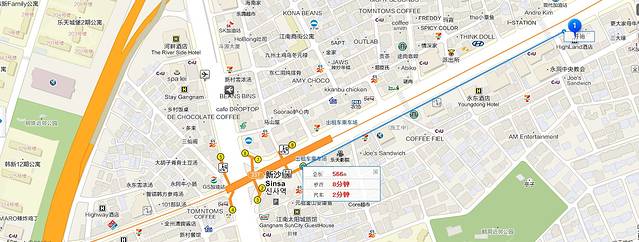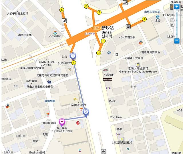 地铁线路:新沙站=Line3=>高速巴士客运站C(最快换乘车厢4-3)=Line7=>江南区厅站C(最快换乘车厢2-2)=盆唐线=>狎鸥亭罗德奥站(Exit2)