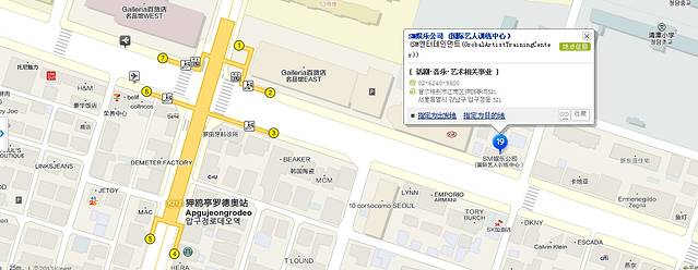 网上很多SM公司的地址其实都是国际部的地址,清潭洞小学的前面,罗德奥站2号口出来直走一点。另外马路对面有一家MCM的专卖店,人很少不用像在免税店那样和别人抢。 绕到后面才是国际部的门。