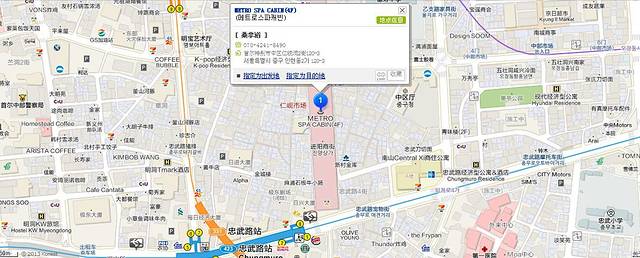 地址:서울시 중구 충무로4가 120-3 진양상가4층线路方式:机场铁路的终点站是首尔站,首尔站是个大站,在首尔站再搭乘4号线,乘坐3站到达忠武路站,8号出口出往前走一点,左边就有条路(8号口无电梯,可以选择从1号口出再过马路),沿着路的右边往前走,上面有滚动屏的LED灯牌显示Metro Spa Cabin向前50米之类的信息,跟着灯牌指示可以找到入口,然后进入电梯间,左手边的第一部电梯(只有这一部可以到达)坐到4F就是前台。如果没有方向,可以问问周围的人sauna怎么走。