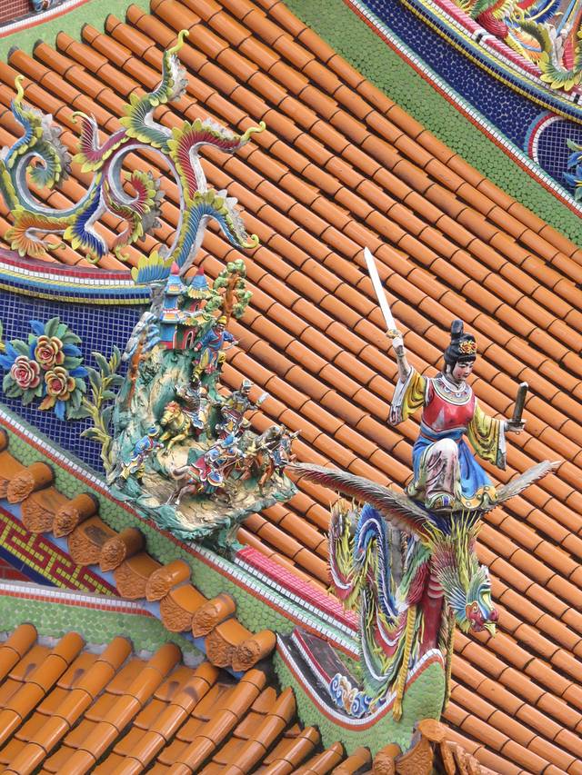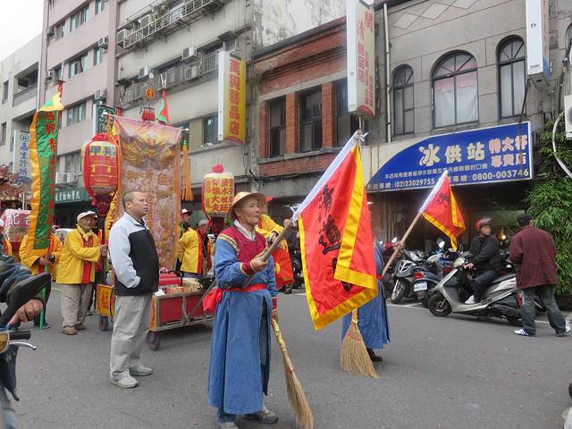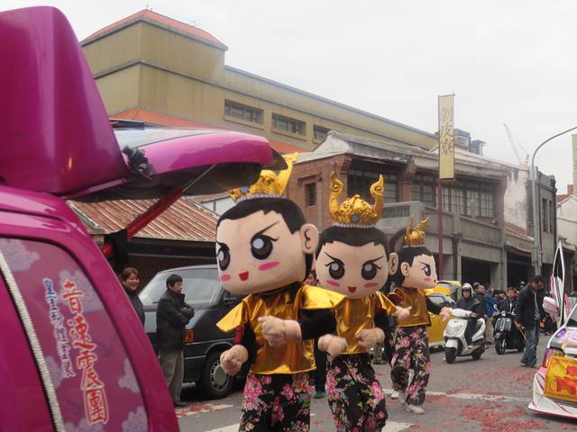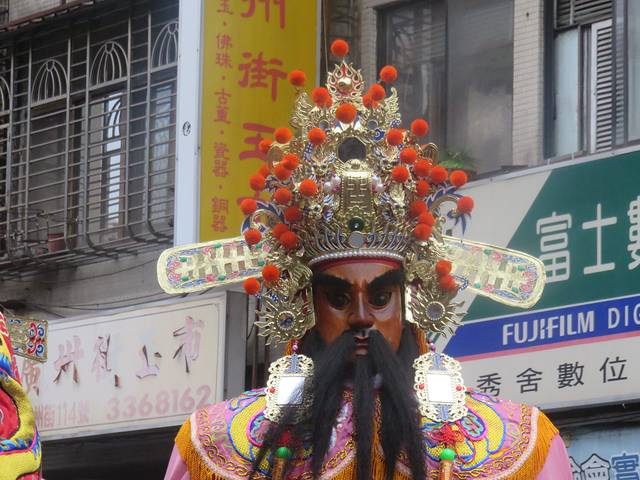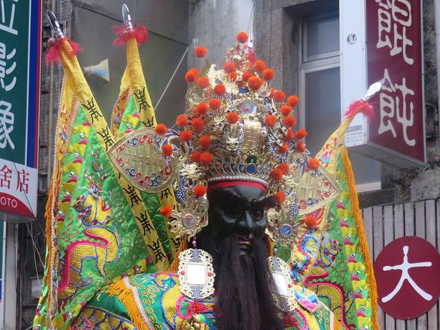 今天恰逢艋舺青山王的圣诞(生日),台北及附近的大小寺庙都派出队伍一起巡游,这个活动称之青山王绕境,又叫艋舺大拜拜,活动时间是每年农历的10月20日到10月23日,其中后两天是活动的高潮。我正在看玻璃橱里的小塑像时,外面的街道上突然鞭炮声大作。我跑上街后不一会儿,绕境队伍便慢慢走了过来。有敲锣打鼓吹唢喇的,有举旗子的,有舞龙舞狮,有扛大旗的,还有花车和车队,比较夸张的是游行队伍里有绘着动漫图案还喷着火的改装车,超大号的车载音箱里竟然放着鸟叔的《江南style》,后面还跟着几个穿着卡通戏服跳夸张舞蹈的人,让人一时搞不清楚这到底是宗教祭祀活动还是狂欢节游行。更有意思的是在整个活动过程中,完全没有交通管制,机车和的士会时不时乱入到游行的队伍里。这次经历大大颠覆了我对台湾宗教民俗活动的印象。