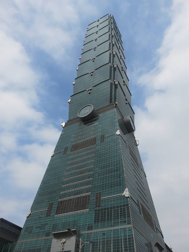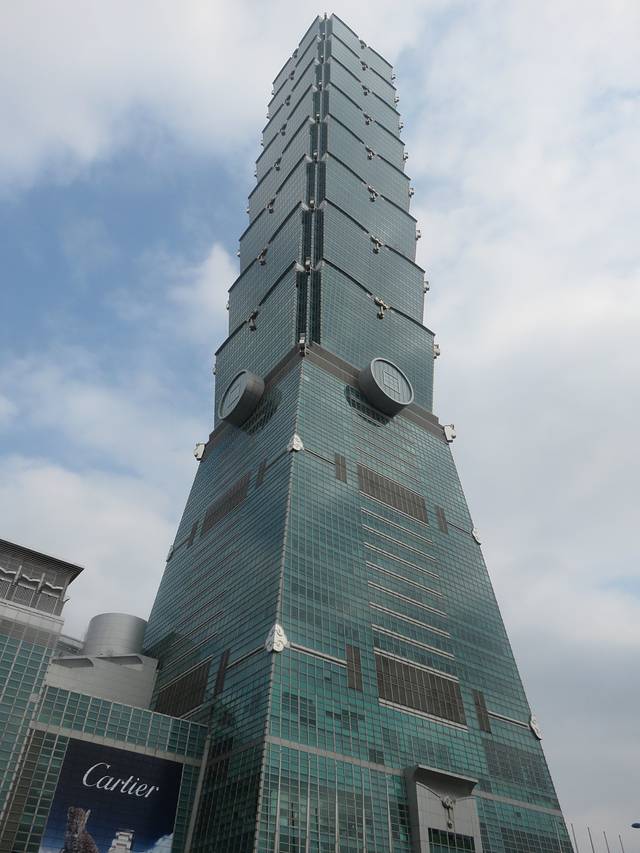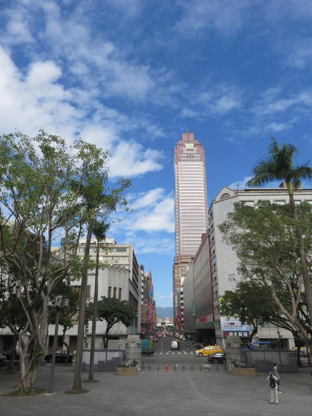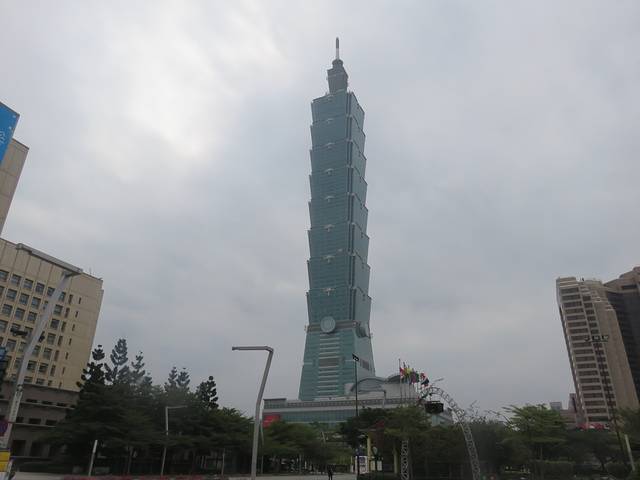 下一站本来是国父纪念馆。我出了台北探索馆之后突然发现台北101就在不远处。在照片和明信片上看到它并不觉得有多美,当看见实物之后才感到美呆了,仿佛有股无形的磁场在吸引我,于是我就被诱拐过去了。这几天一直阴雨,等我走到101大楼脚下时,却突然一小片蓝天,难道这就是所谓的心诚则灵??