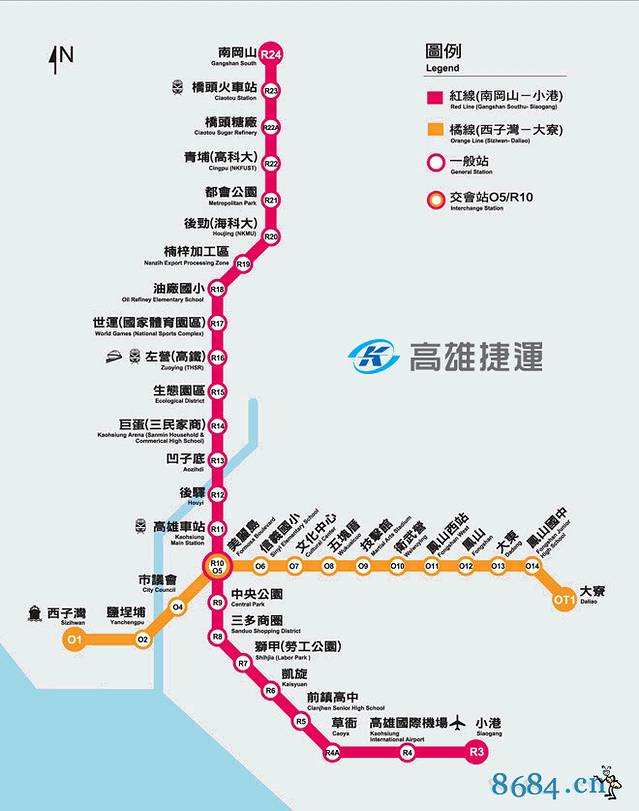 高雄:可成高雄捷运红线从 【高雄车站】坐到【左营(高铁)站】,共5站,票价NT25,约11min。