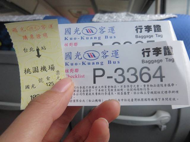 和车票一起的还有行李证,司机叔叔会帮你把对应号码的贴纸贴到行李上去,再放入正确的行李舱。行李舱有两个,对应桃园机场的两栋航站楼,不清楚自己要去那一栋的话告诉司机叔叔或售票员自己的飞机是哪个航空公司的就行了,他们会帮你确定的。