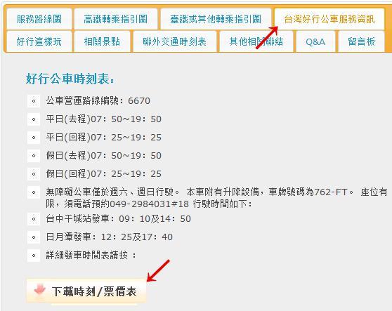 但台湾好行并不是一个客运集团的名称,而是台湾观光部门整合了多家客运公司的班车、专为旅游目的而开设的巴士线路的统称。各条线路的起讫站点均为各大城市的火车、高铁、客运站及热门的旅游景点。查询时刻表、价目表的方式是在线路信息页面下方选项卡点击“台湾好行公车服务资讯”,即可看到“下载时刻/票价表”的按钮。台湾好行可刷悠游卡(且有折扣),不过最划算的方式是购买往返票。